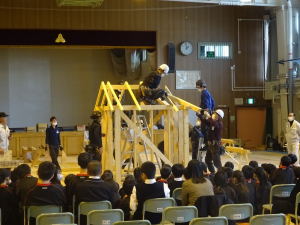 学校教育協力運動を11月19日㈬に札幌市立柏中学校で開催しました。齋野書記長のあいさつの後に実習内容、道具や注意事項などの説明を行った後に家ができるまでの工程をミニ上棟式として実演。役員が解説を交えながら進行し、完成時には生徒から拍手と歓声が上がりました。その後は鉋掛け、木材切り、釘打ち・電動工具を使用したビス打ち等のコーナーへそれぞれ移動してもらい製作等を体験してもらいました。このほか、丸太を切ったコースターの材料と紙ヤスリを使用して、それぞれオリジナルコースターを作る作業も行いました。作業実習終了後は質疑応答の時間を設けられ、生徒から「やりがいを感じるのはどんな時ですか」「高いところで怖いと思ったことはありますか」「中学一年時に今のお仕事に就こうと考えていましたか」「休みの日に鍛えたり、勉強したりしていますか」などの質問があり、髙橋住宅技術部長や講師団の皆さんが丁寧に回答していました。